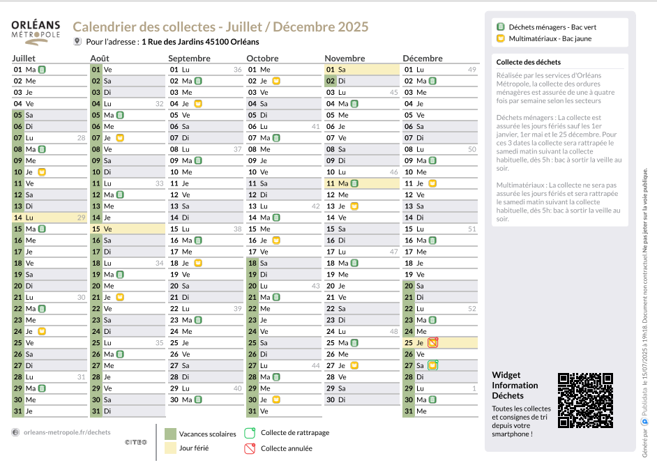 Bonjour, Voici le calendrier de collecte des ordures mis à jour pour la période de Juillet à Décembre 2025.